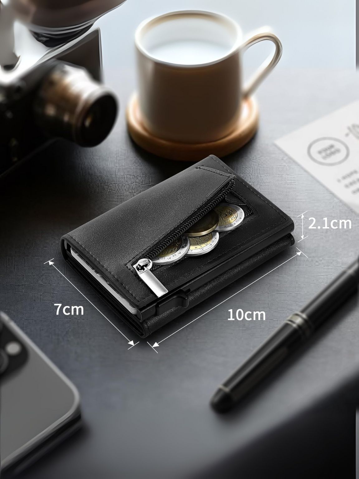 Il portafoglio misura solo 10 x 7 x 2.1 cm, ma può contenere fino a 8 carte, diverse banconote e monete, rendendolo portatile e pratico.